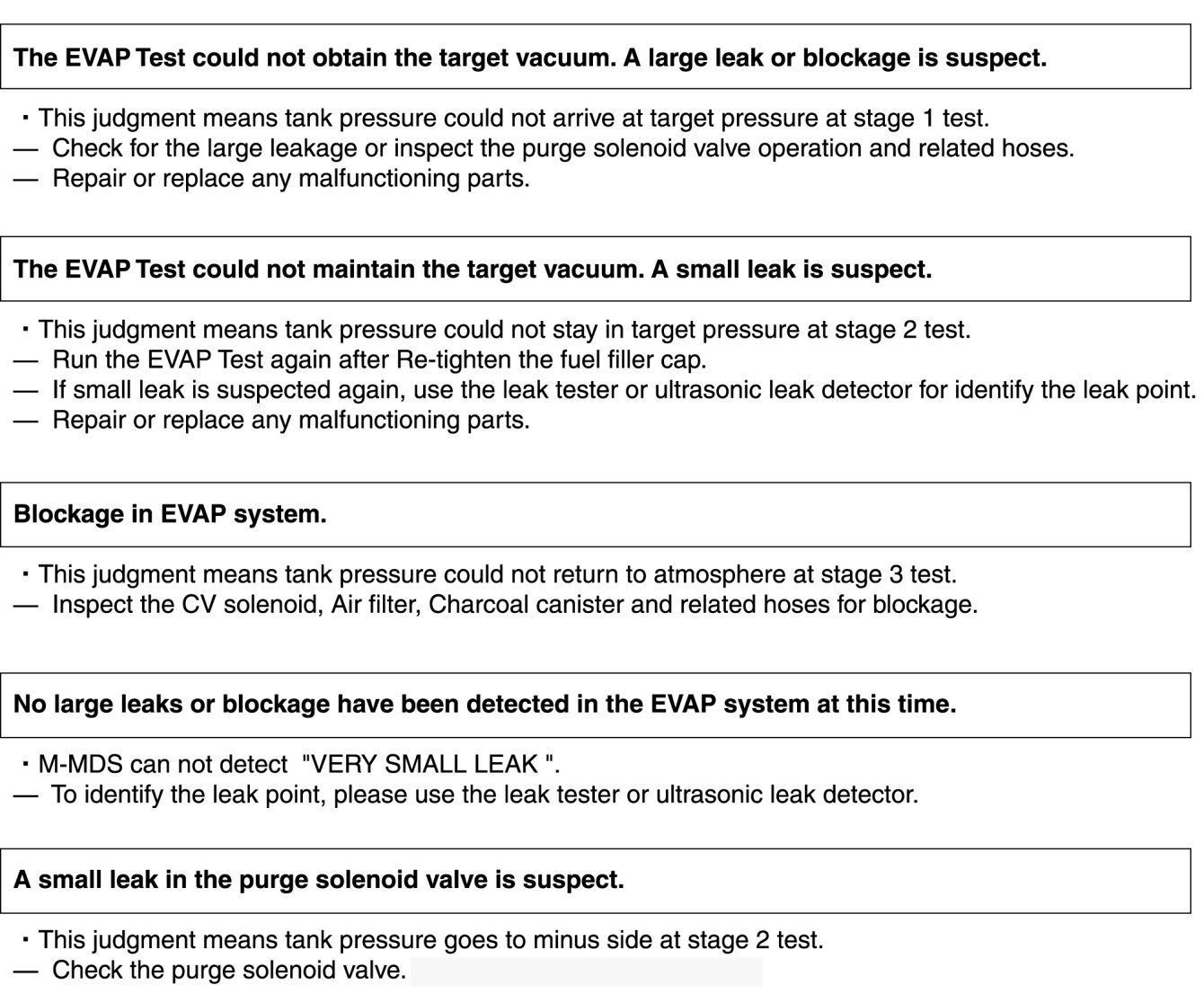 - M-MDS detect the small/large leak or blockage based on fuel tank pressure at the end of EVAP Test.