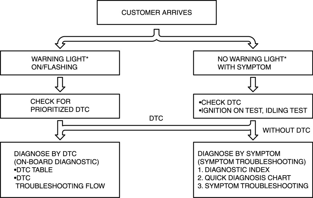 - When the customer reports a vehicle malfunction, check the malfunction indicator lamp (MIL) indication and diagnostic trouble code (DTC), then diagnose the malfunction according to the following flowchart: