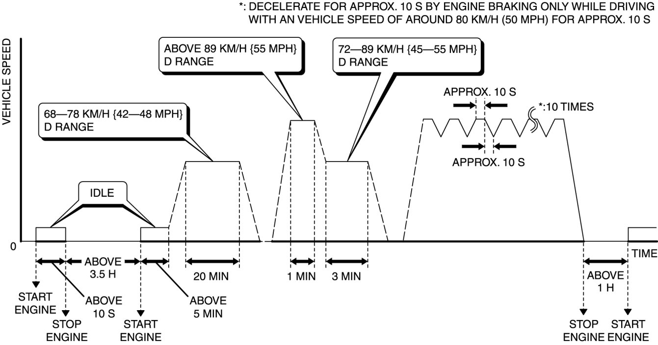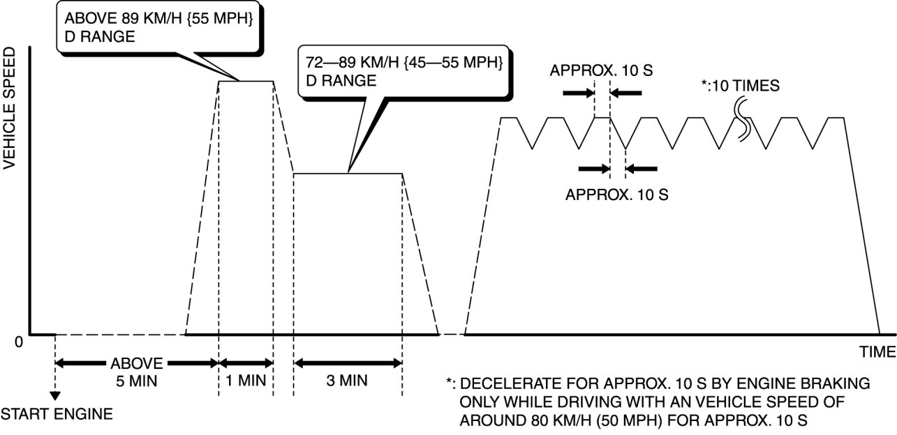 5. With the vehicle stopped, race the engine at the engine speed indicated, and then drive the vehicle as shown in the graph. The driving conditions before driving at constant speed are not specified. If possible, monitor RPM PID for engine speed during this procedure.
