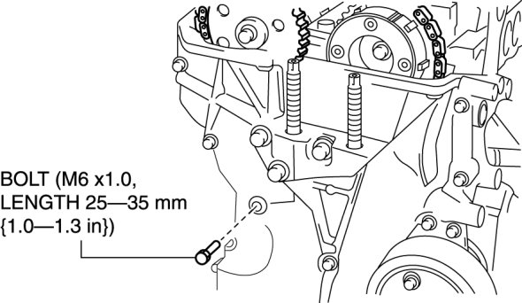 a. Insert a suitable bolt (M6 X 1.0, length 25-35 mm {1.0-1.3 in}) into the engine front cover upper blind plug and tighten it until it contacts the chain tensioner arm, and then rotate it back one turn. (Set the bolt slightly away from the chain tensioner arm so that it does not contact it.)