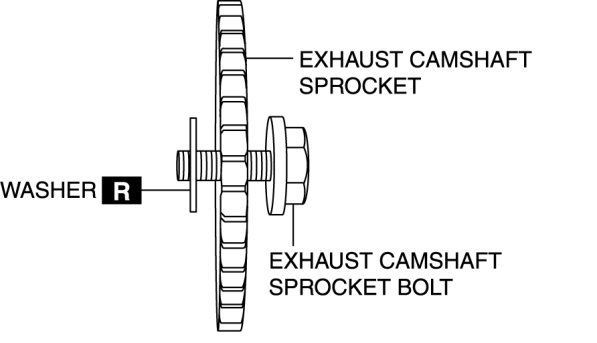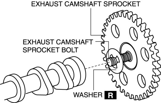 34. Install the exhaust camshaft sprocket bolt, exhaust camshaft sprocket, and a new washer as a single unit.