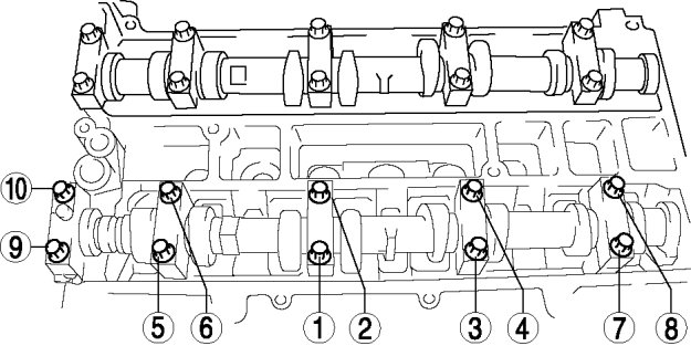 22. Loosen the camshaft cap bolts in two or three steps in the order shown in the figure and remove the camshaft cap.