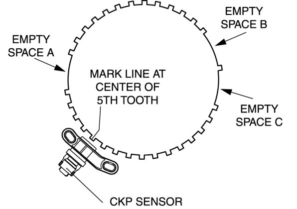 2. Fit the center of the CKP sensor with the fifth tooth (counting counterclockwise from the empty space A as shown in the figure) of the pulse wheel.