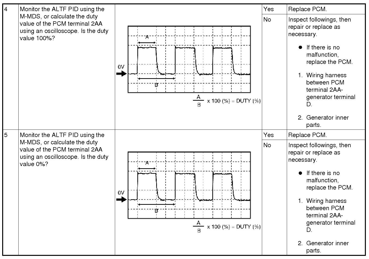 If the generator field coil duty value does not change when electrical loads (such as headlights, blower motor, rear window defroster, brake lights) are on or off, inspection with discharged battery is needed.