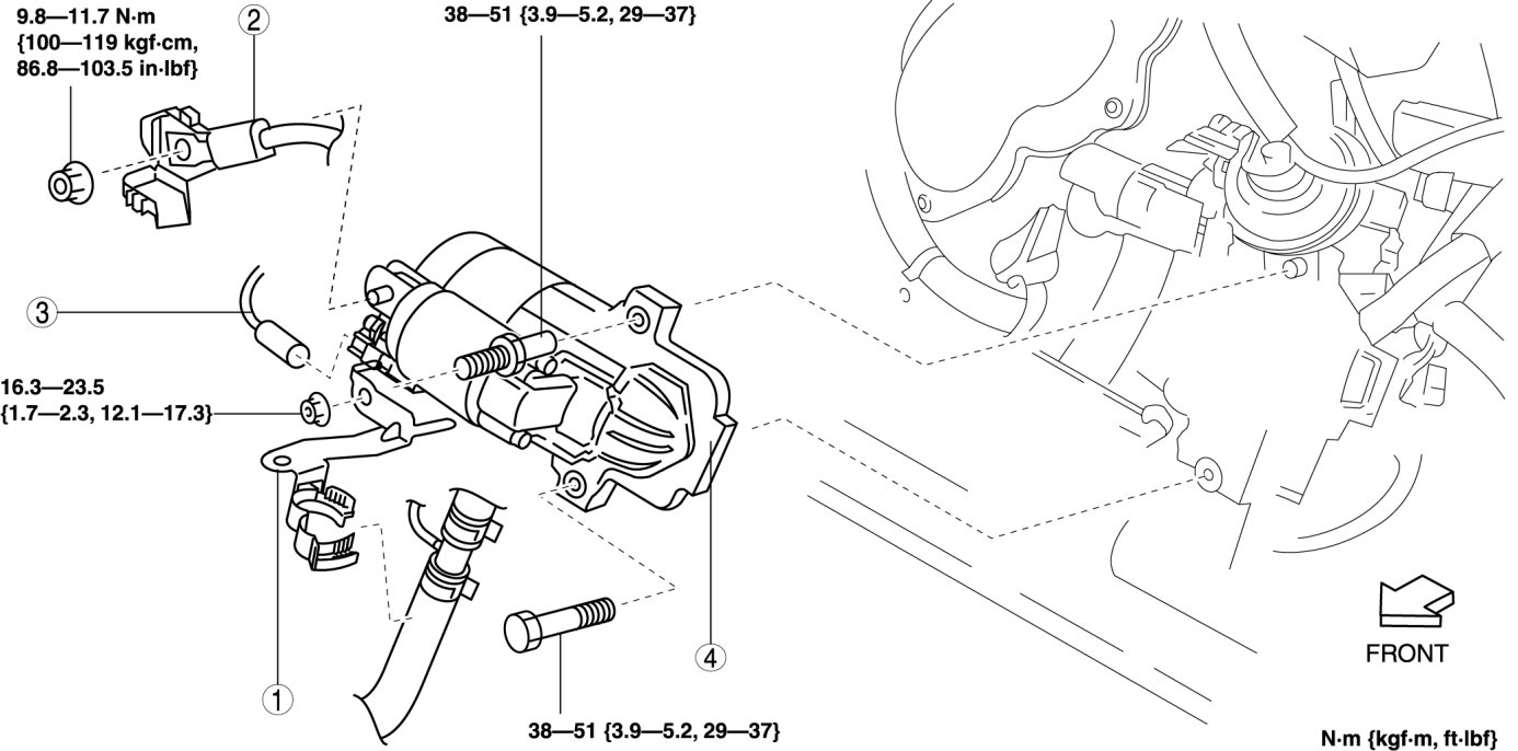 - When the battery cables are connected, touching the vehicle body with starter terminal B will generate sparks. This can cause personal injury, fire, and damage to the electrical components. Always disconnect the negative battery cable before performing the following operation.