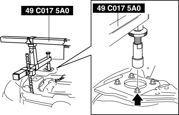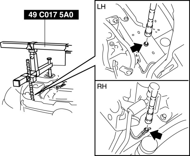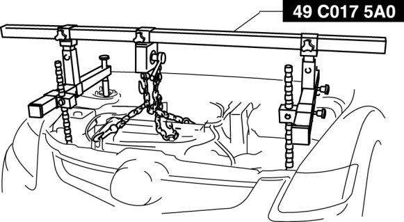 1. Adjust the SST (49 C017 5A0) and lean the engine toward the transaxle.