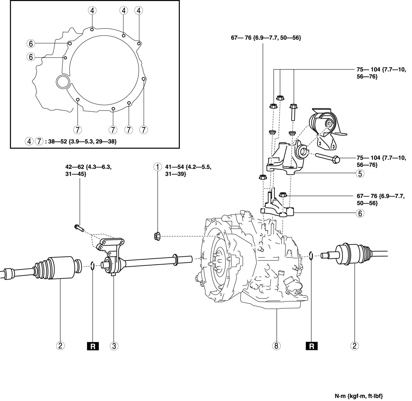- 75-104 Nm {7.7-10 kgf-m, 56-76 ft-lbf}