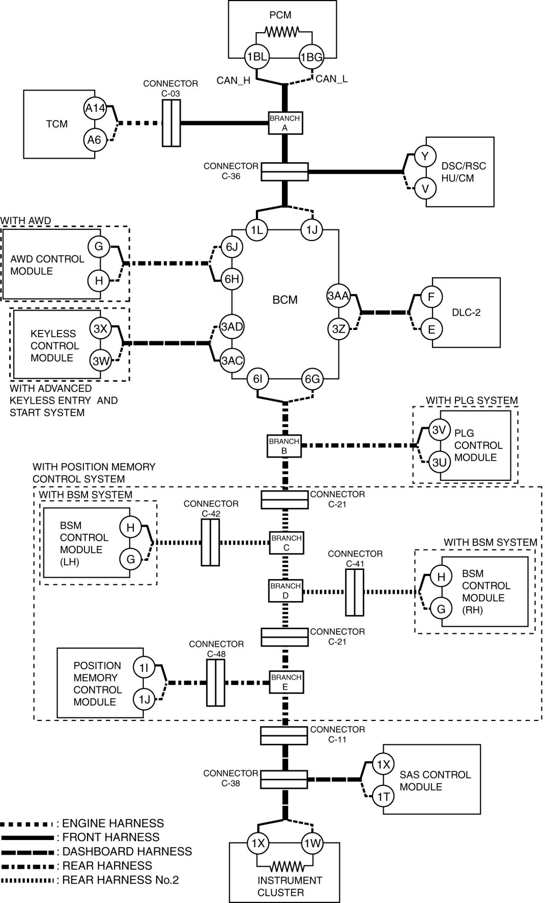 - Improper insertion, connector terminal damage, deformation, corrosion, or disconnection of PCM, BCM or connector C-36