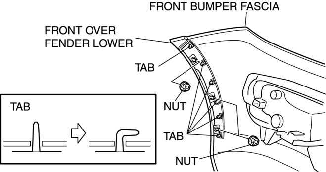 1. Attach the front over fender lower to the front bumper fascia with nuts.