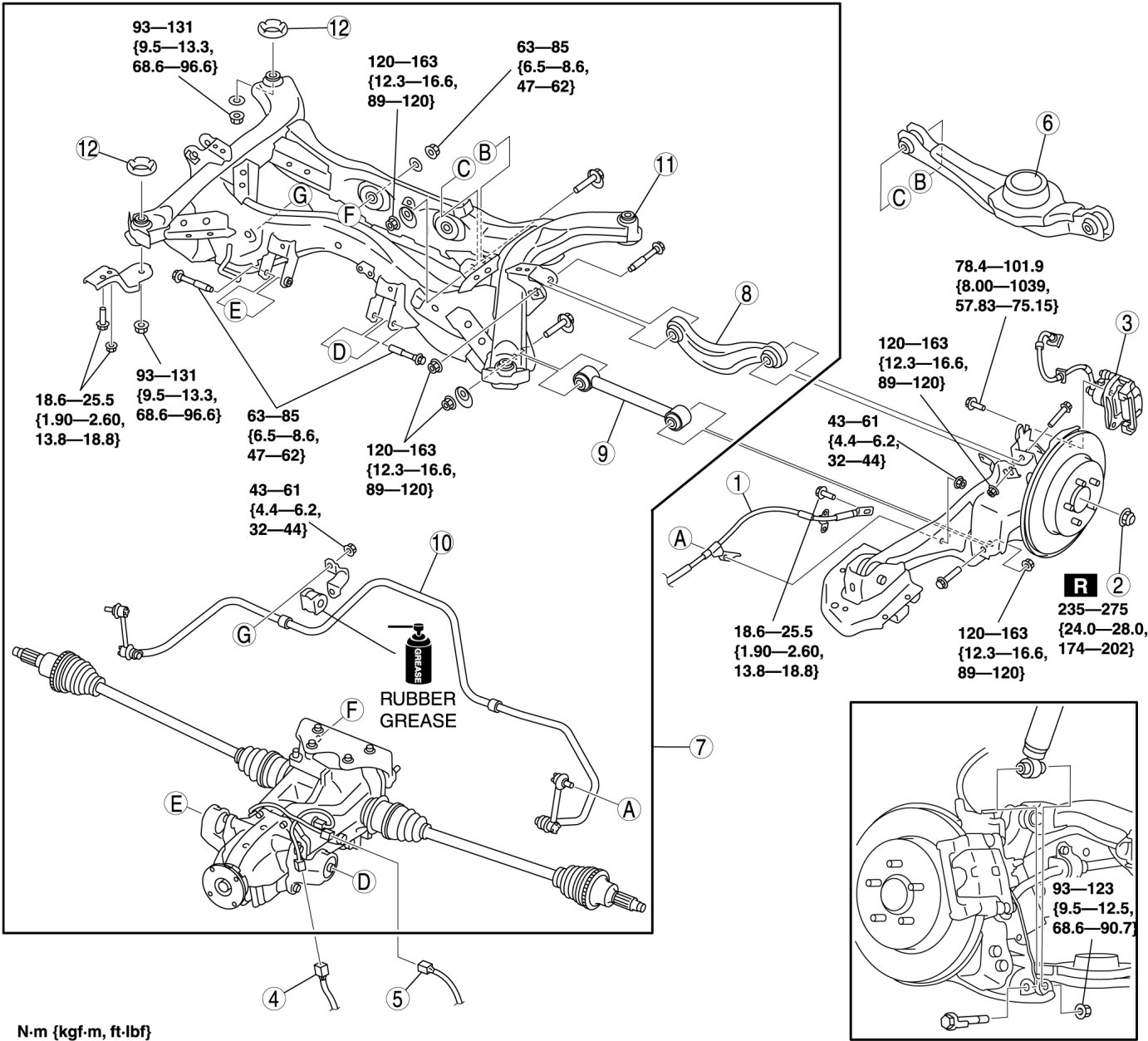 - The rear upper arm inner bolt cannot be tightened completely with the rear upper arm installed to the vehicle due to the narrow operation space. Therefore, mark the position before removing the rear upper arm, align the rear crossmember and rear upper arm markings when installing the rear upper arm, and tighten the rear upper arm inner bolt completely before installing the rear crossmember component to the vehicle.