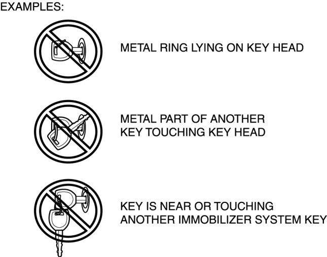 - The following conditions may cause poor signal communication between the key and vehicle, resulting in the engine not starting or a key registration error. Do not perform any work under the following conditions: