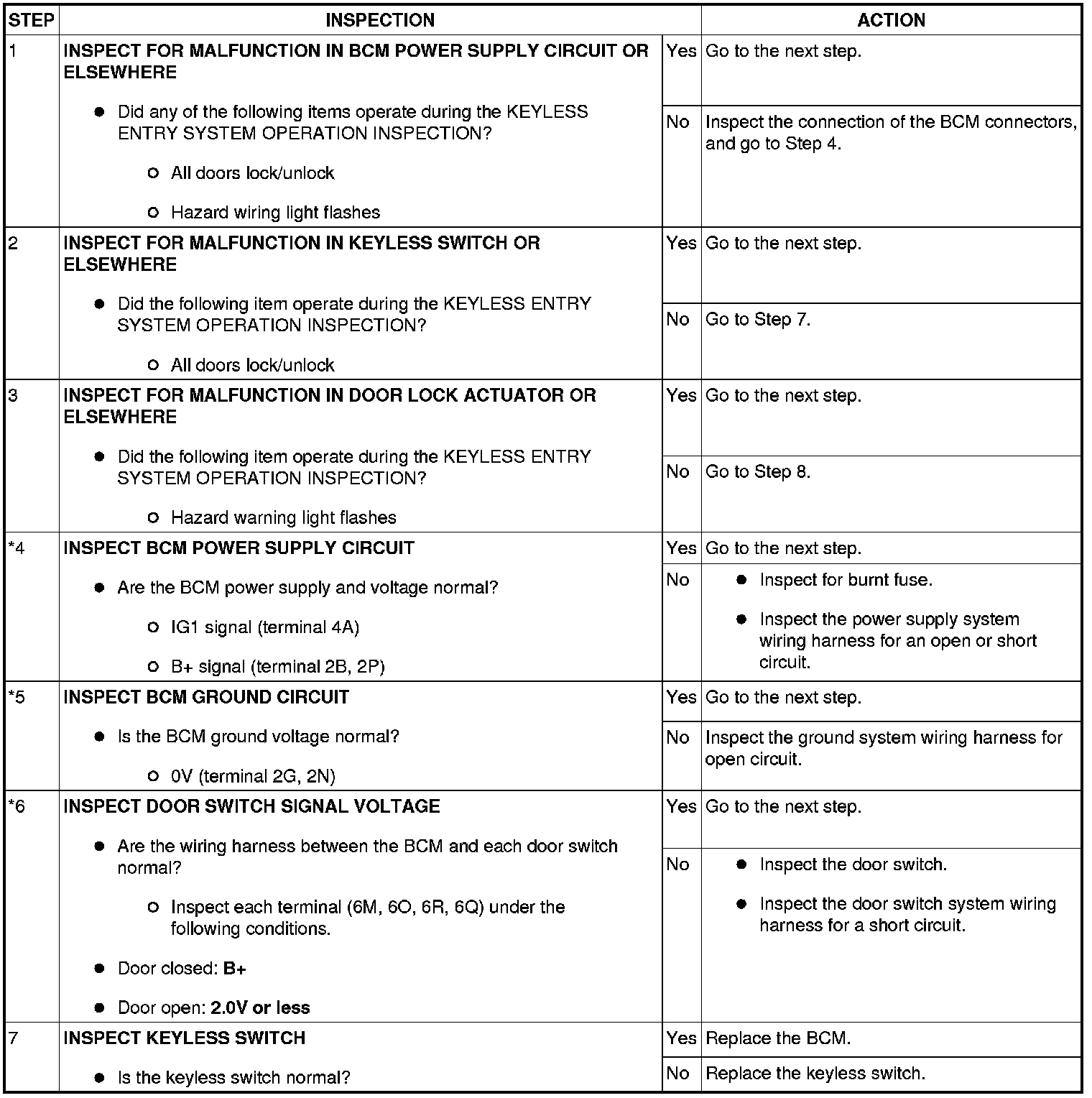 - When performing an asterisked (*) troubleshooting inspection, slightly shake the wiring harness and connectors while performing the inspection to discover whether poor contact points are the cause of any intermittent malfunctions. If there is a problem, verify that the connectors, terminals and wiring harnesses are connected correctly and undamaged.