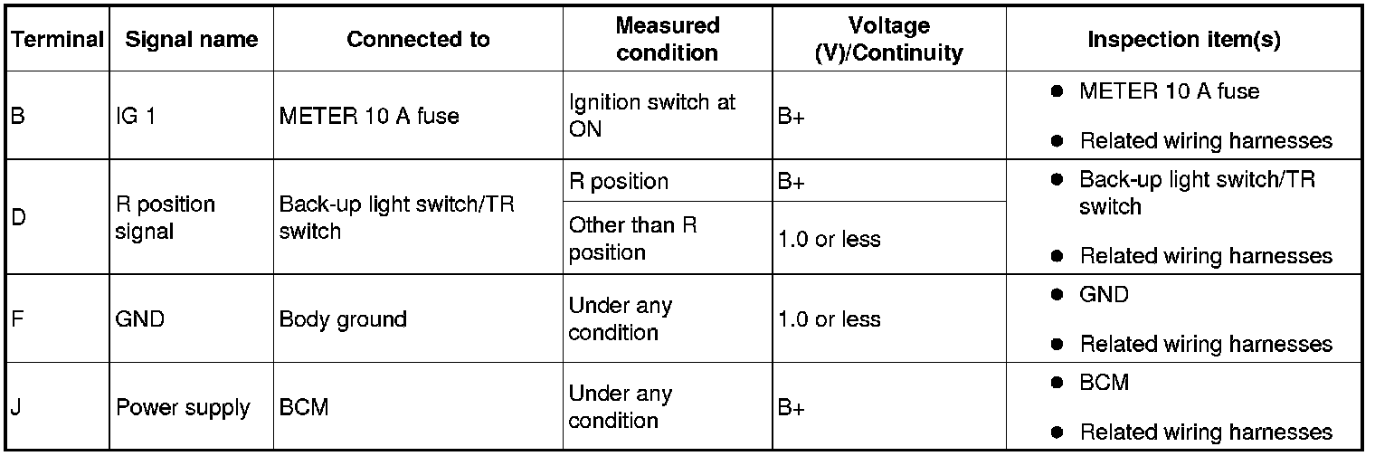 - If the voltage is not as specified in the Terminal Voltage Table (Reference), inspect the parts under "Inspection item (s)" and related wiring harnesses.