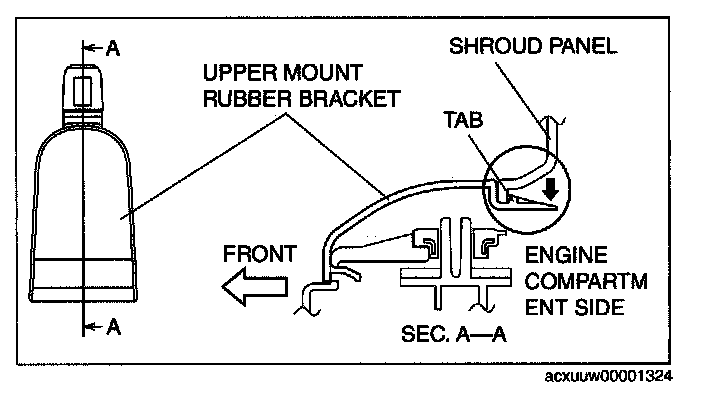 1. Remove the upper mount rubber bracket while pressing down the upper mount rubber bracket tab in the direction of the arrow.