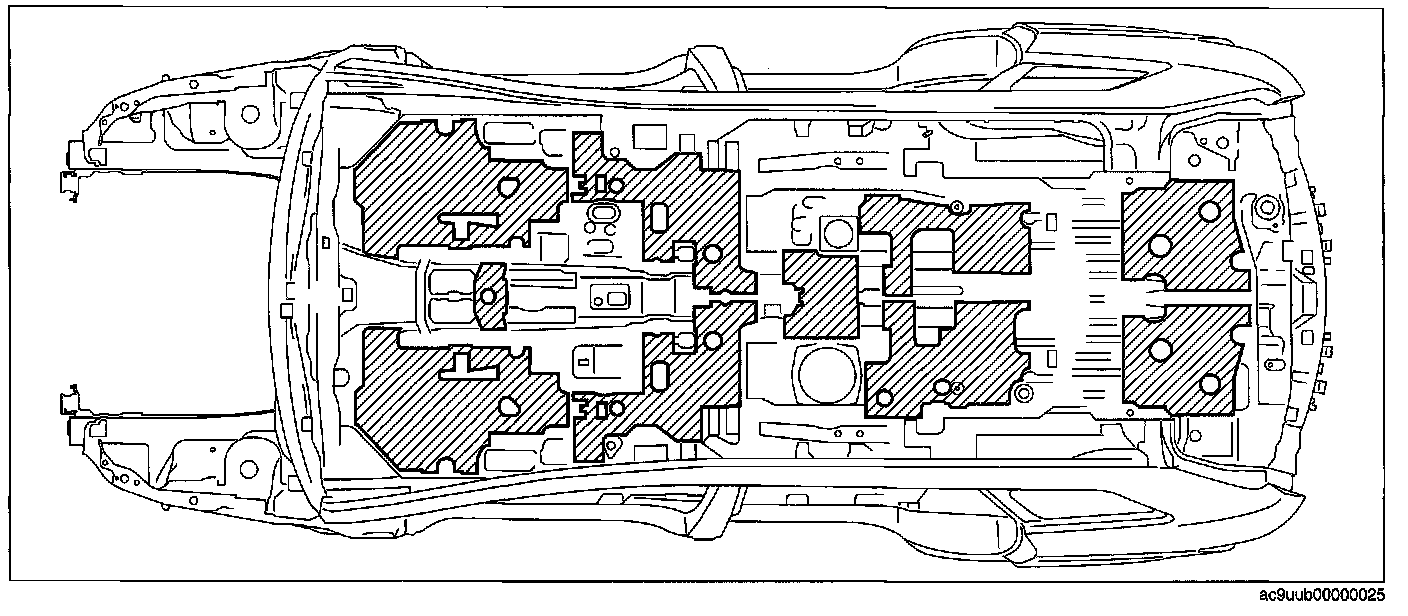 DAMPING SHEET REPLACEMENT [WATER-PROOF AND RUST PREVENTIVE]After repairing the body, attach the damping sheet to the location shown in the figure for noise insulation.