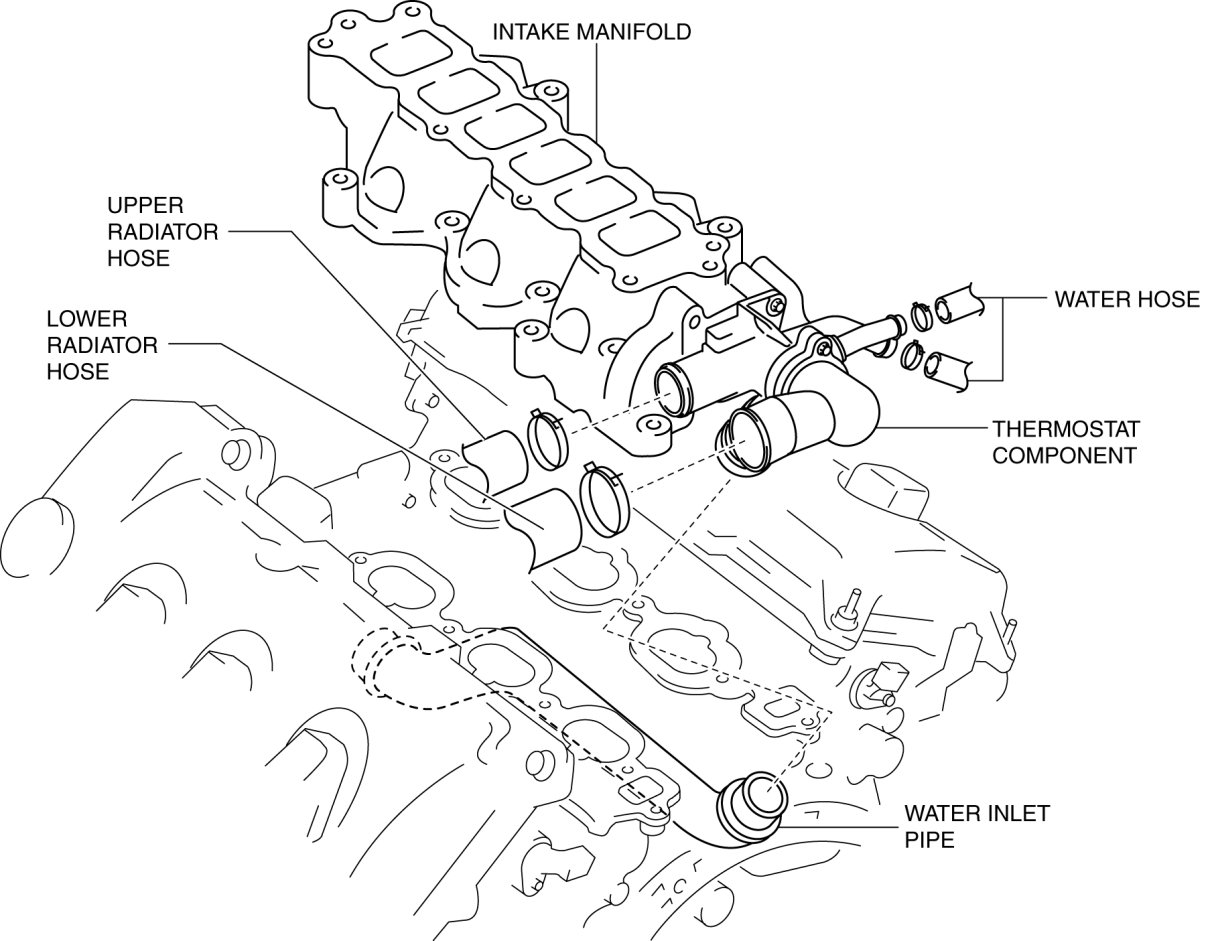 d. Thermostat component side of the water inlet pipe which is under the intake manifold