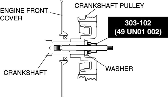 1. Remove the washer from the crankshaft pulley lock bolt, install a suitable spacer (thickness: approx. 14 mm {0.55 in}, diameter: approx. 30 mm {1.18 in}), (similar to front shock absorber lower nut) to the crankshaft pulley lock bolt, and install the crankshaft pulley lock bolt to the crankshaft.