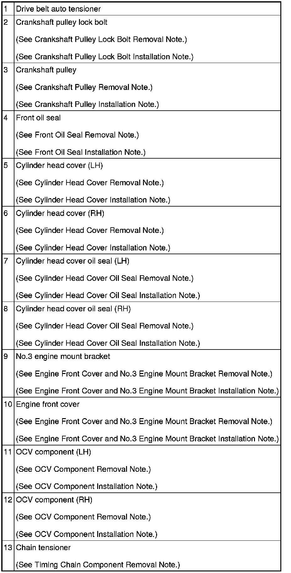 - The following procedure "TIMING CHAIN REMOVAL/INSTALLATION" is performed after the engine and transaxle component is removed from the vehicle. Removal and Replacement