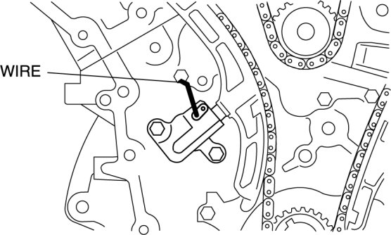 7. Insert an approx. 1.5 mm {0.059 in} thick wire or paper clip where the link plate hole and the tensioner body hole overlap to fix the link plate and lock the plunger.