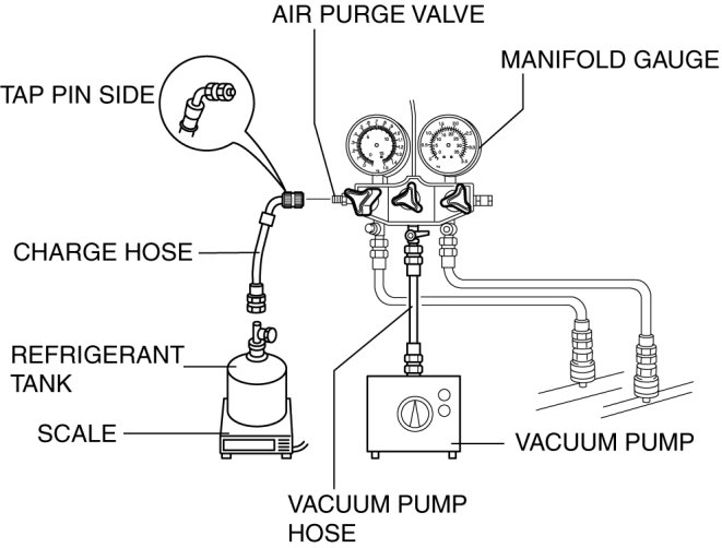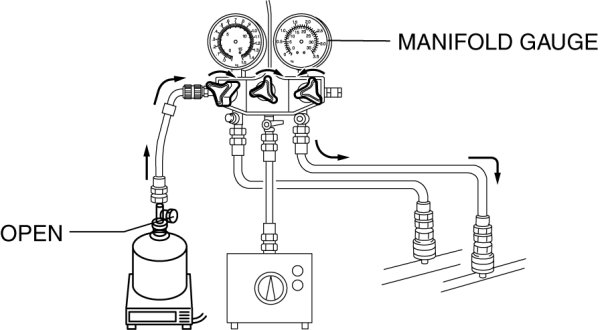 10. Open the low-pressure side valve of the manifold gauge and charge with refrigerant until the weight of the refrigerant tank has decreased regular amount from the amount in Step 2.