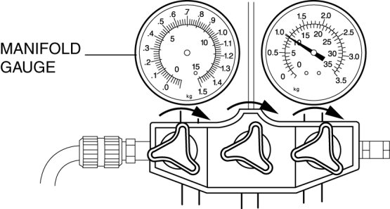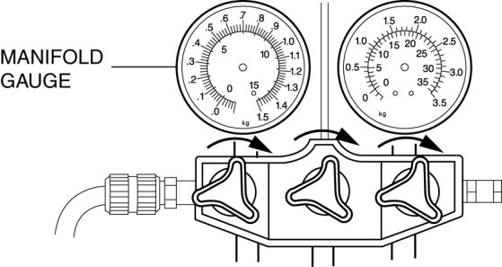 4. When the high-pressure side reading increases to 0.098 MPa {1.0 kgf/cm2, 14 psi}, close the low-pressure side valve of the manifold gauge.