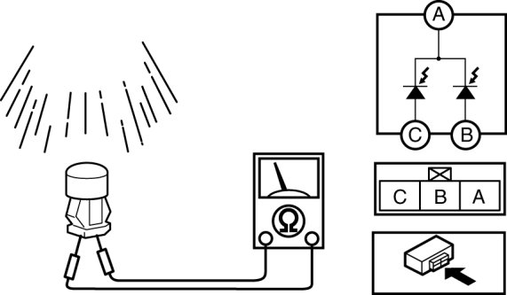 1. Using a tester, connect the positive (+) lead to solar radiation sensor terminal A, the negative (-) lead to terminal B or C, then measure the resistance.