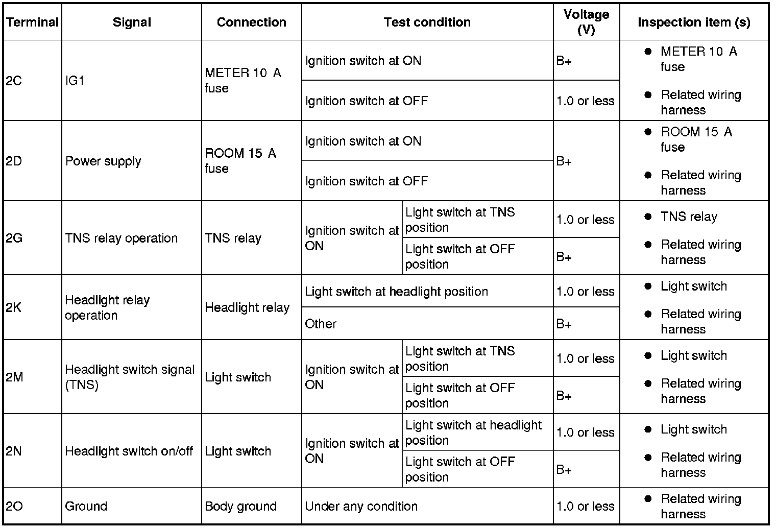 - If the voltage is not as specified in the Terminal Voltage Table, inspect the parts under "Inspection item (s)".