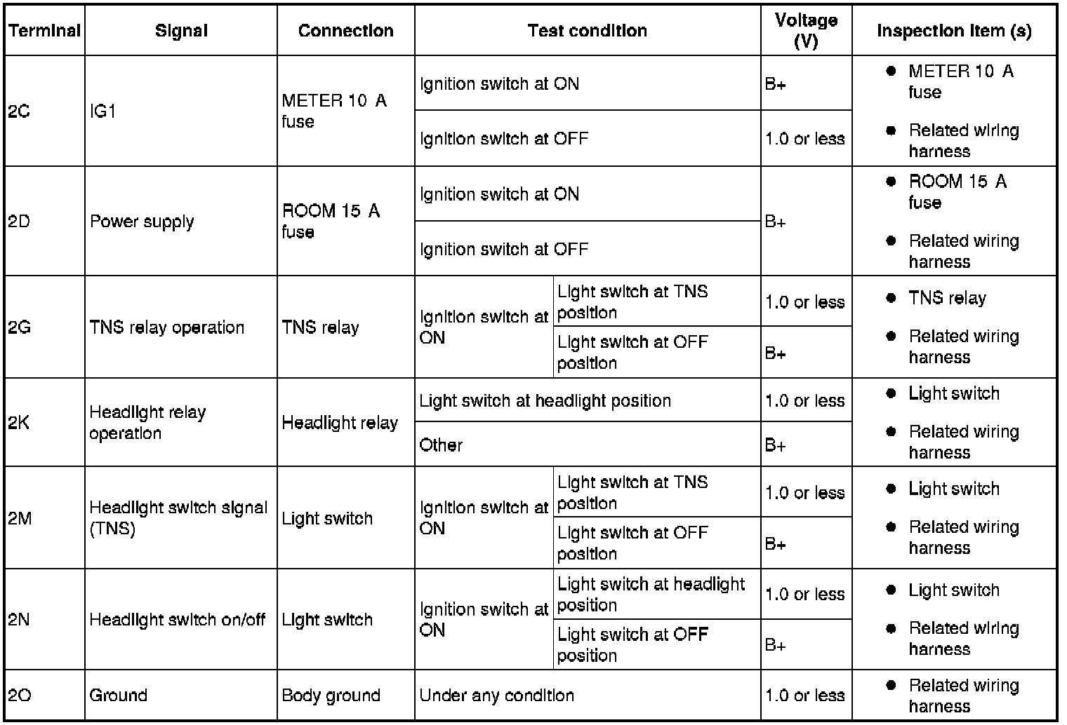 - If the voltage is not as specified in the Terminal Voltage Table, inspect the parts under "Inspection item (s)".