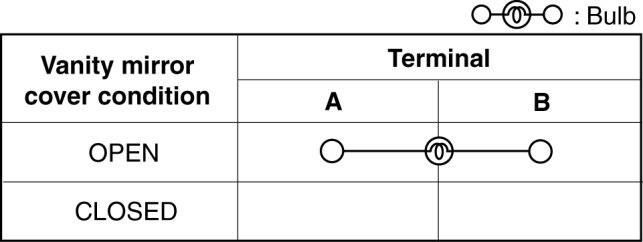 Verify that the continuity between the vanity mirror illumination terminals is as indicated in the table.