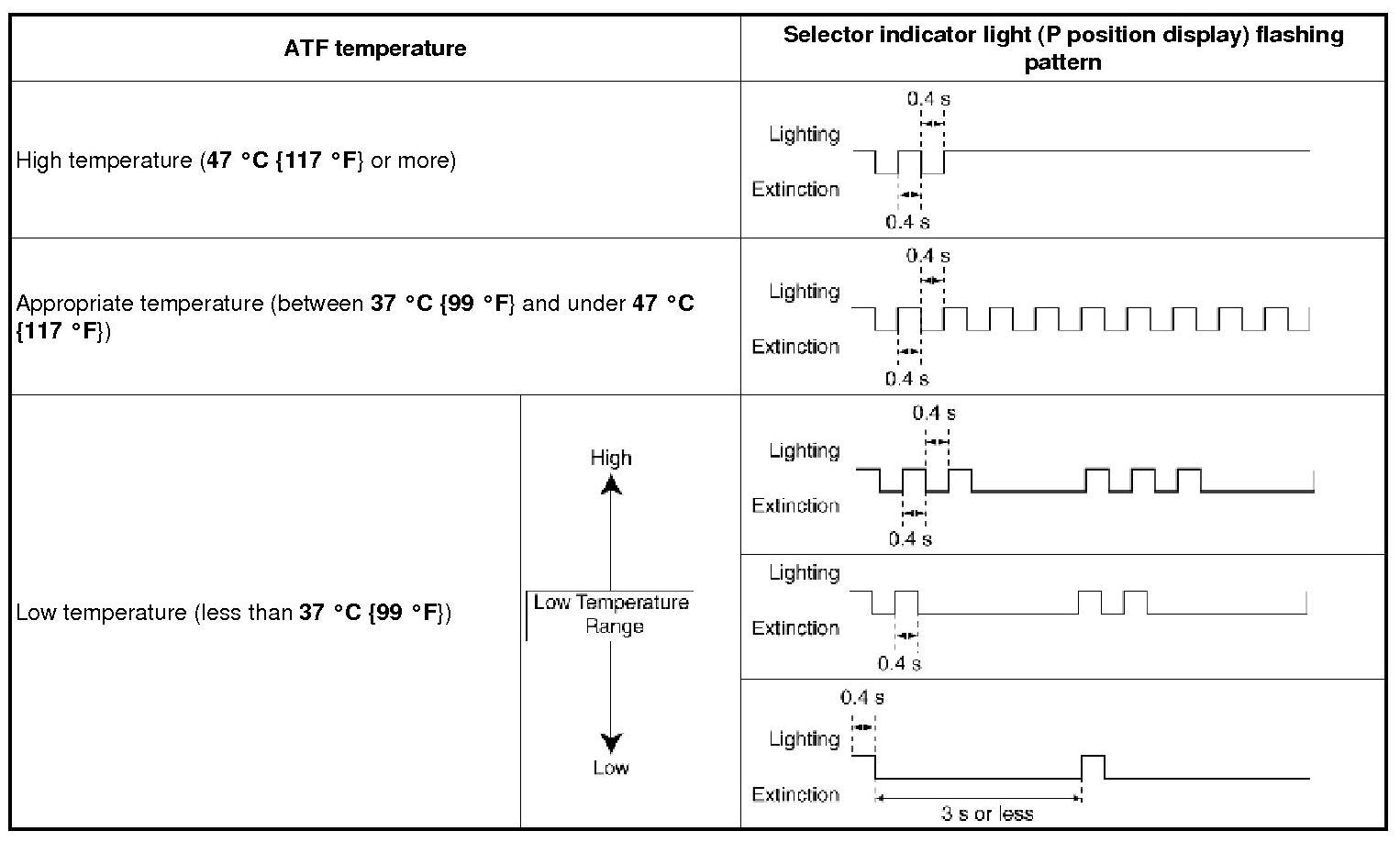 6. Verify the ATF temperature using the P position display flashing pattern.