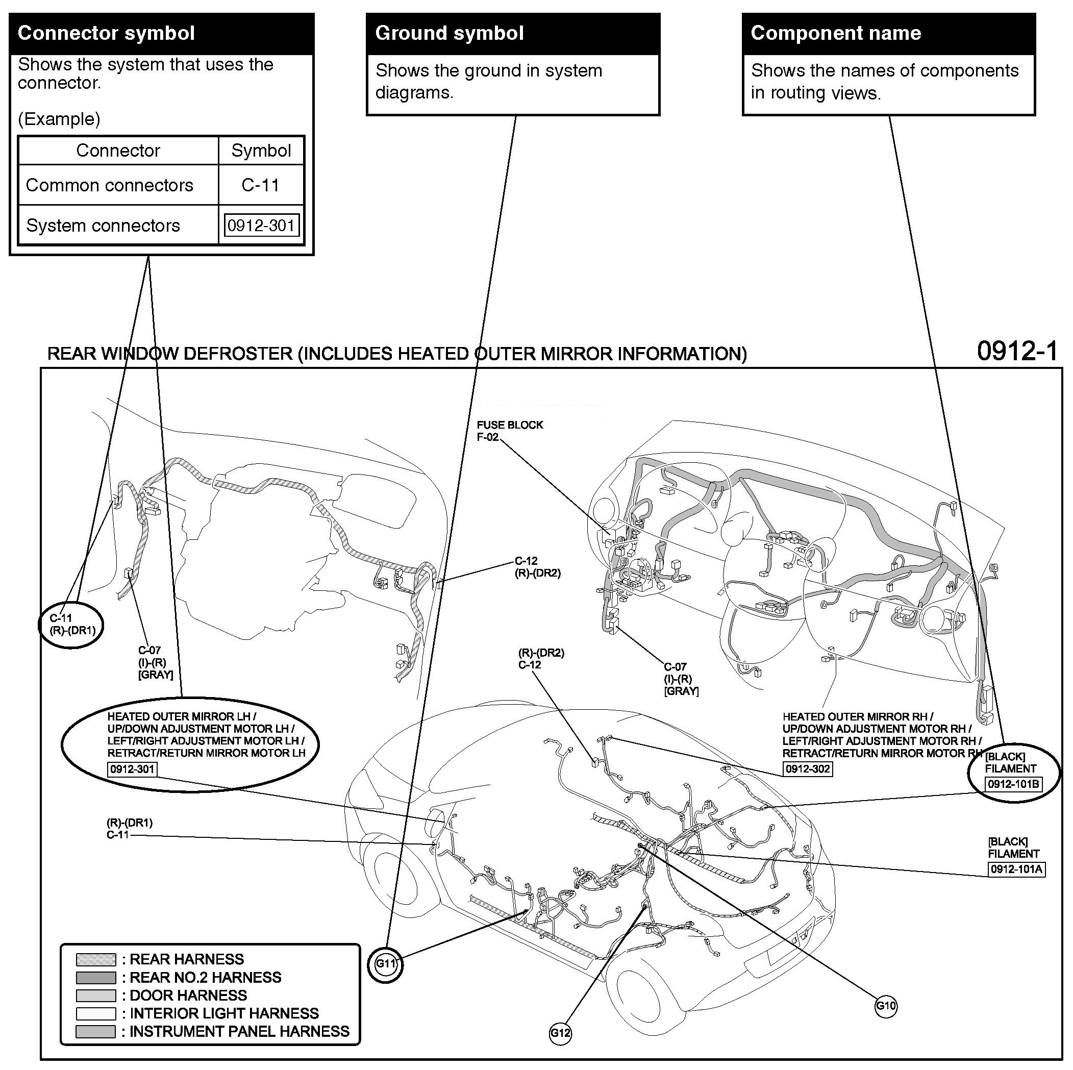 The routing view shows where electrical components are on the system circuit diagram by call out line and connector symbols.
