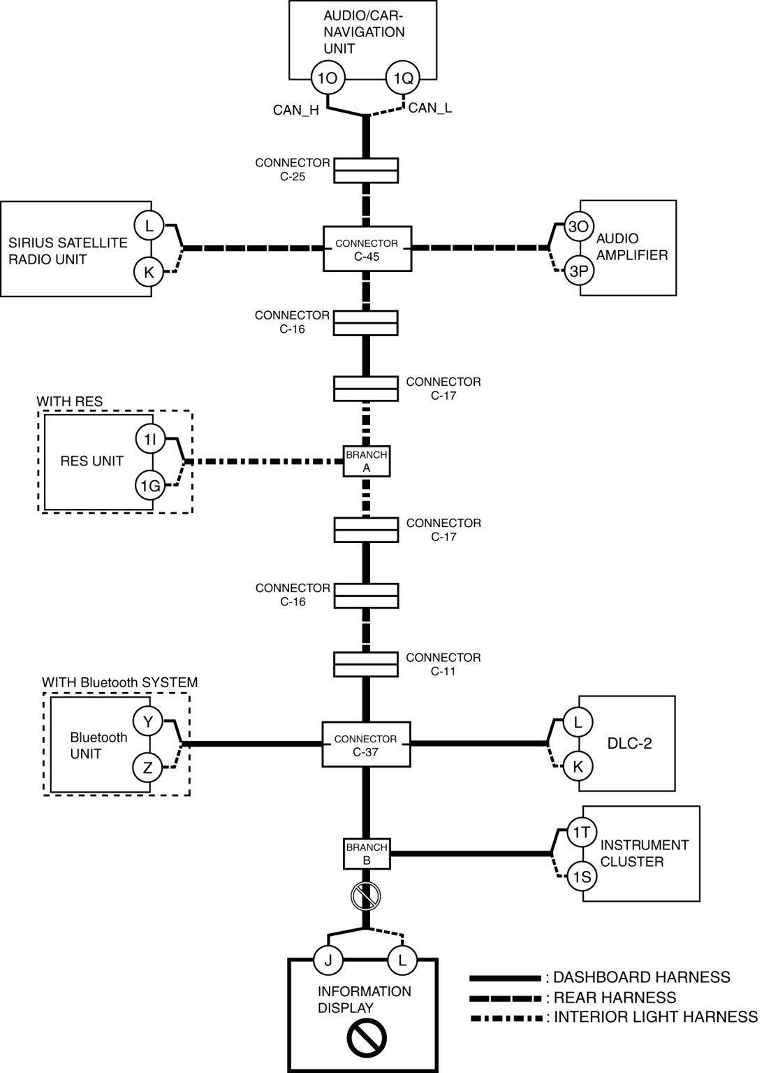 - Open circuit in wiring harness between audio/car-navigation unit and connector C-25