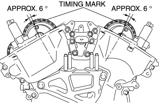 a. Rotate the crankshaft clockwise and verify that the timing mark of the intake side camshaft sprocket is in the position shown in the figure. In this position, the No.1 cylinder is at the TDC of the compression stroke.