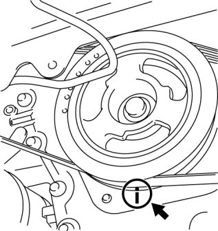 c. Mark the crank pulley and engine front cover as shown in the figure.