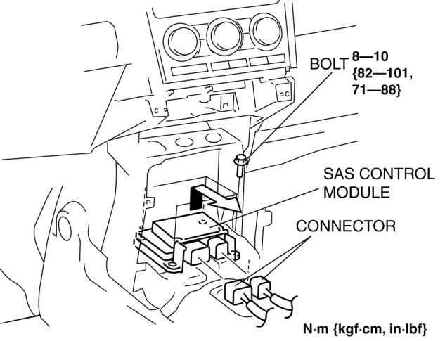 - Connecting the SAS control module with the SAS control module not securely fixed to the vehicle is dangerous. When the ignition switch is turned to the ON position, the SAS control module could tilt causing the SAS control module to detect that the vehicle is in a rollover condition, which may accidentally operate (deploy) the curtain air bag module and pre-tensioner seat belt. Therefore, before turning the ignition switch to the ON position with the connector connected, securely fix the SAS control module to the vehicle.
