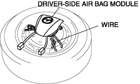 3. Place the driver-side air bag module on the center of the tire wheel with the padded surface facing up. To secure the air bag module to the tire wheel, wrap a wire (cross section 1.25 mm2 {0.002 in2} or more) through the wheel and the bolt installation holes of the air bag module at least 4 times.