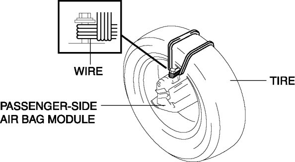 4. Place the padded surface of the passenger-side air bag module facing the center of the tire as shown in the figure. To secure the air bag module to the tire wheel, wrap a wire (cross section 1.25 mm2 {0.002 in2} or more) through the tire and around the bolts at least 4 times as shown in the figure.