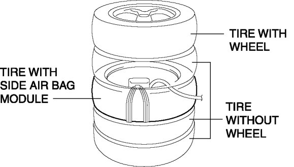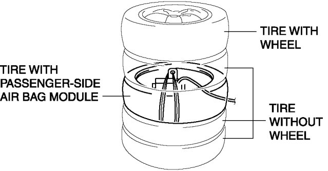 5. Stack the tire with the passenger-side air bag module on top of two tires without wheels. Stack a tire without a wheel on top of the tire with the passenger-side air bag module, and then stack another tire with a wheel on the very top.