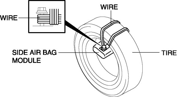 3. Place the padded surface of the side air bag module facing the center of the tire as shown in the figure. To secure the air bag module to the tire wheel, wrap a wire (cross section 1.25 mm2 {0.002 in2} or more) through the tire and around the bolts at least 4 times.