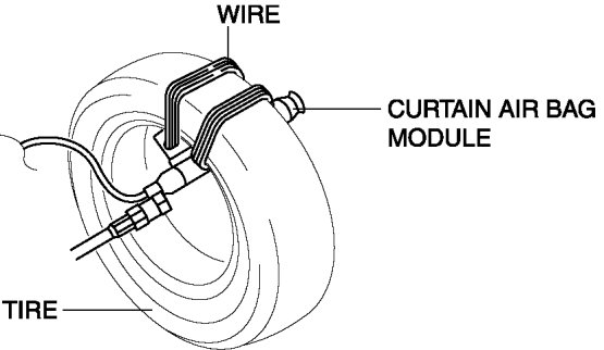 6. Secure the curtain air bag module to the tire, by wrapping a wire (cross section 1.25 mm2 {0.002 in2} or more) through the tire and the bolt installation holes at least 4 times as shown in the figure.