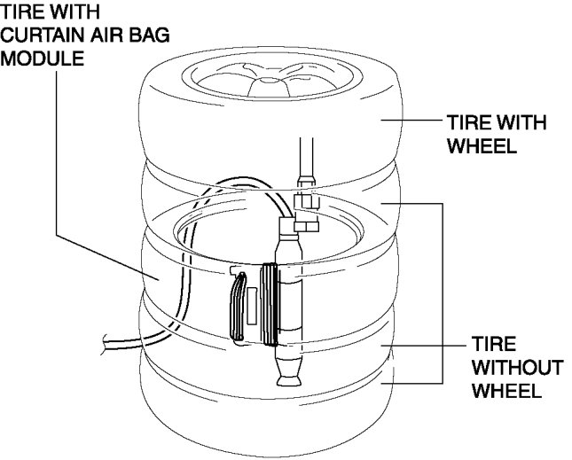 7. Stack the tire with the curtain air bag module on top of two tires without wheels. Stack a tire without a wheel on top of the tire with the curtain air bag module, and then stack another tire with a wheel on the very top.