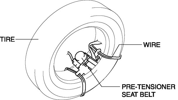 3. Put the pre-tensioner seat belt inside the tire and secure it to the tire by wrapping a wire (cross section of 1.25mm2 {0.002in2} or more) through the tire and the bolt installation holes at least 4 times.