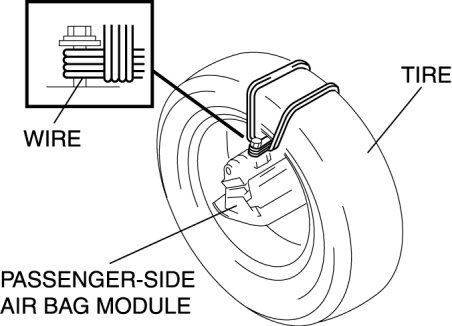 4. Place the padded surface of the passenger-side air bag module facing the center of the tire as shown in the figure. To secure the air bag module to the tire wheel, wrap a wire (cross section 1.25 mm2 {0.002 in2} or more) through the tire and around the bolts at least 4 times as shown in the figure.
