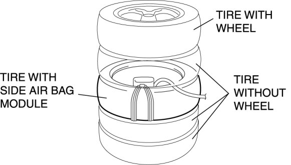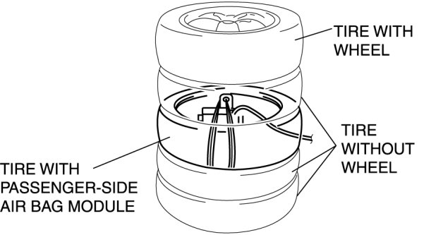 5. Stack the tire with the passenger-side air bag module on top of two tires without wheels. Stack a tire without a wheel on top of the tire with the passenger-side air bag module, and then stack another tire with a wheel on the very top.