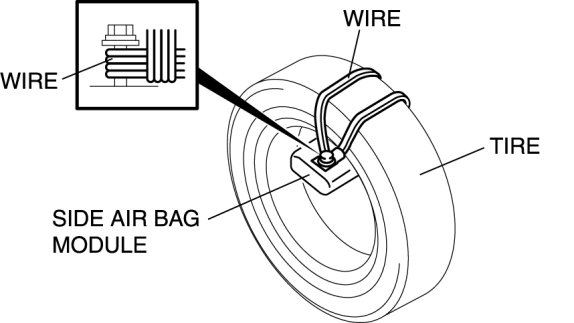 3. Place the padded surface of the side air bag module facing the center of the tire as shown in the figure. To secure the air bag module to the tire wheel, wrap a wire (cross section 1.25 mm2 {0.002 in2} or more) through the tire and around the bolts at least 4 times.