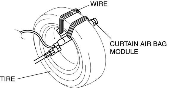 6. Secure the curtain air bag module to the tire, by wrapping a wire (cross section 1.25 mm2 {0.002 in2} or more) through the tire and the bolt installation holes at least 4 times as shown in the figure.