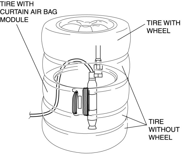 7. Stack the tire with the curtain air bag module on top of two tires without wheels. Stack a tire without a wheel on top of the tire with the curtain air bag module, and then stack another tire with a wheel on the very top.