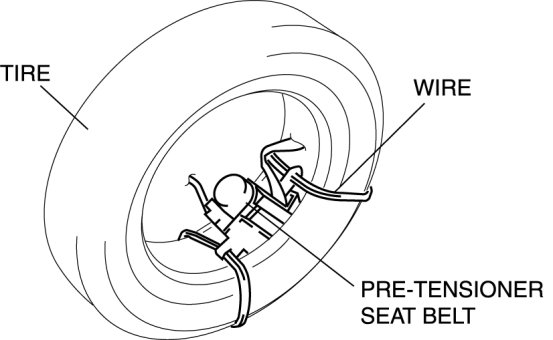 3. Put the pre-tensioner seat belt inside the tire and secure it to the tire by wrapping a wire (cross section of 1.25mm2 {0.002in2} or more) through the tire and the bolt installation holes at least 4 times.