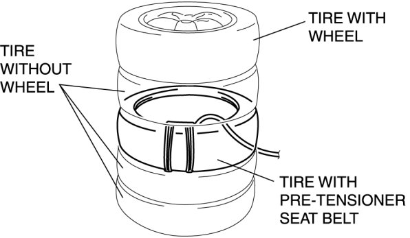 4. Stack the tire with the pre-tensioner seat belt on to of two tires without wheels. Stack a tire without a wheel on top of the tire with the pre-tensioner seat belt, and then stack another tire with a wheel on the very top.