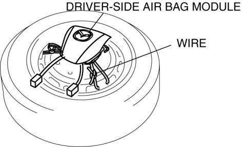 3. Place the driver-side air bag module on the center of the tire wheel with the padded surface facing up. To secure the air bag module to the tire wheel, wrap a wire (cross section 1.25 mm2 {0.002 in2} or more) through the wheel and the bolt installation holes of the air bag module at least 4 times.
